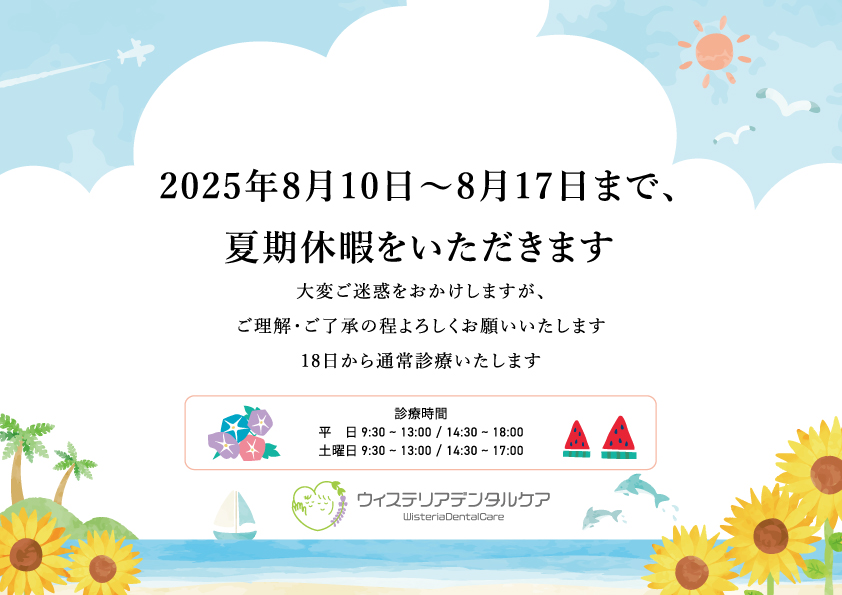 ウィステリアデンタルケアは2025年8月10日(日)~8月17日(日)まで、夏期休暇をいただきます。