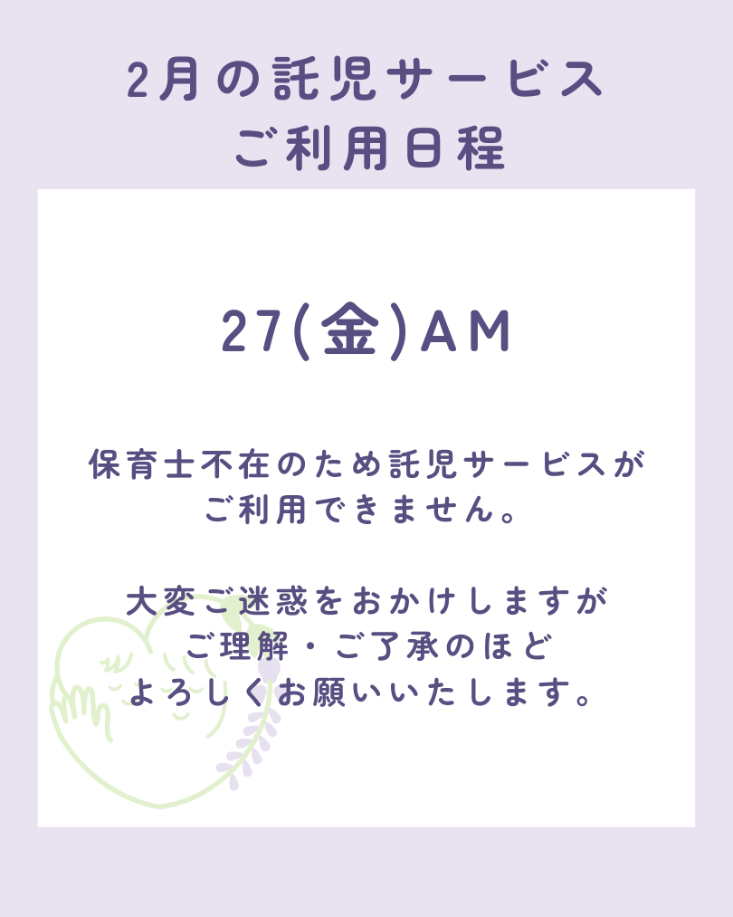 誠に勝手ながら、上記日程は託児サービスをお休みとさせていただきます。